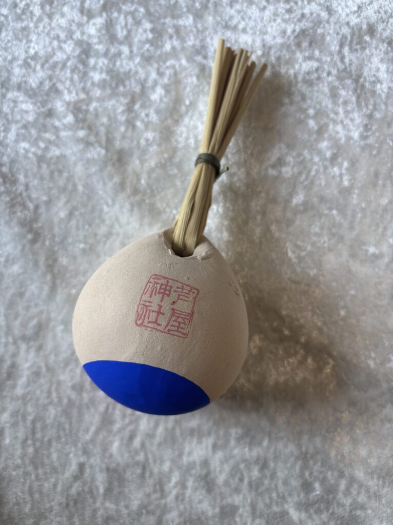 土粘土で作られていて、鈴の下は太陽を表す赤と、水を表す青に塗られています。
