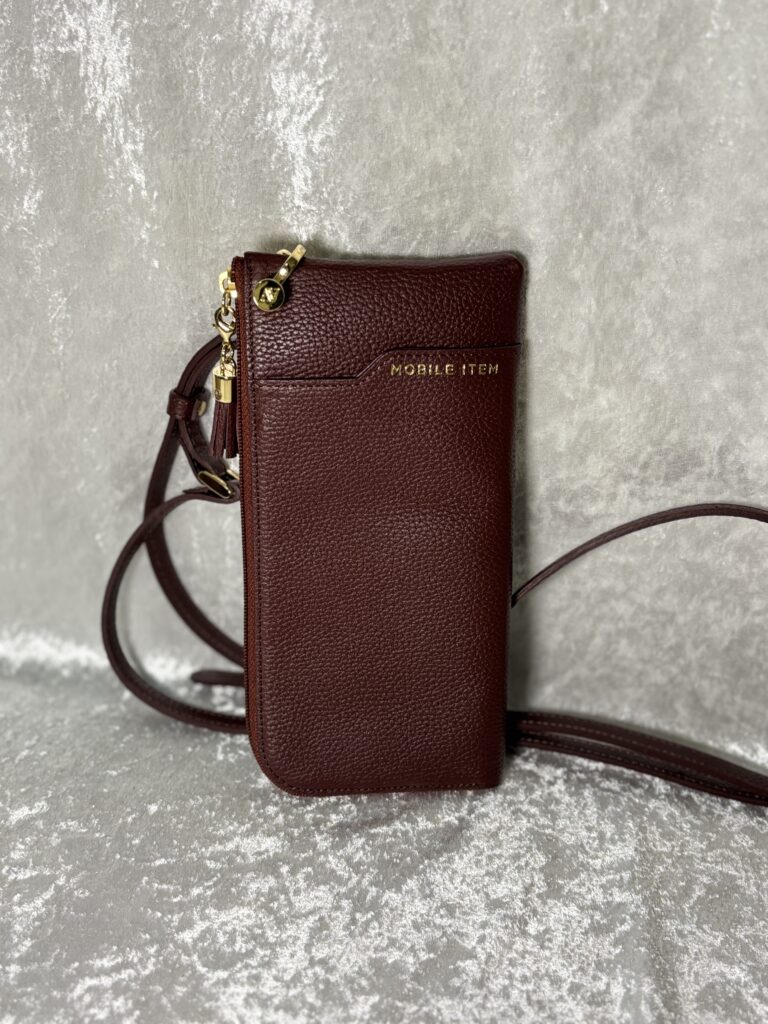 大きさは、お財布とスマートフォン、ハンカチが入るぐらいですね。