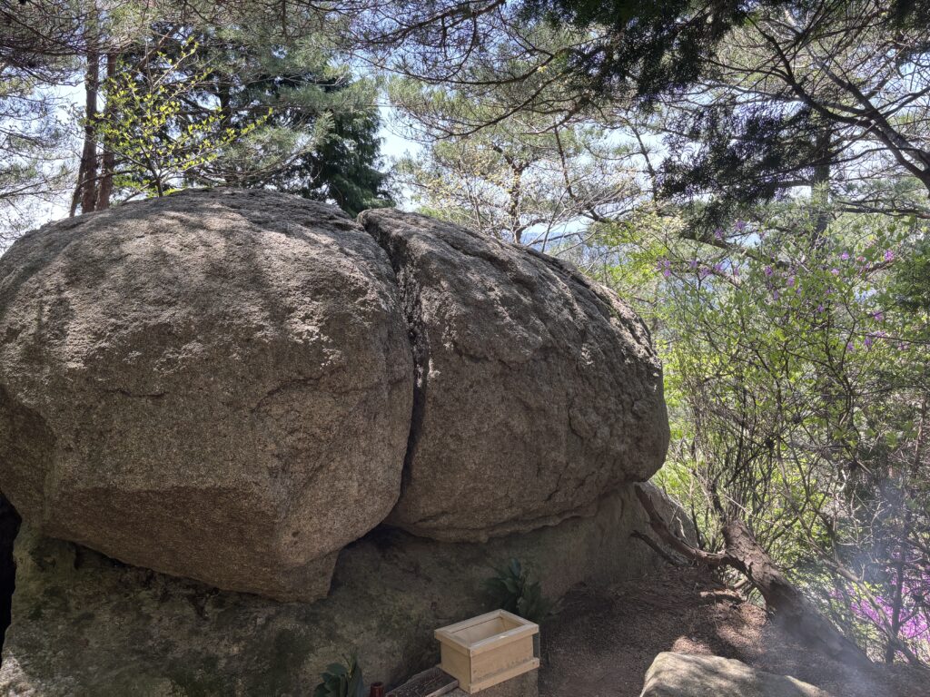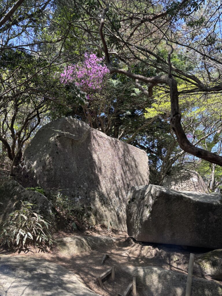 私が歩いた山の上美術館側からだと、最初にまず仰臥岩(ぎょうがいわ)という磐座が見え、そして真っ二つに割れた雲ヶ岩(くもがいわ)とご対面。