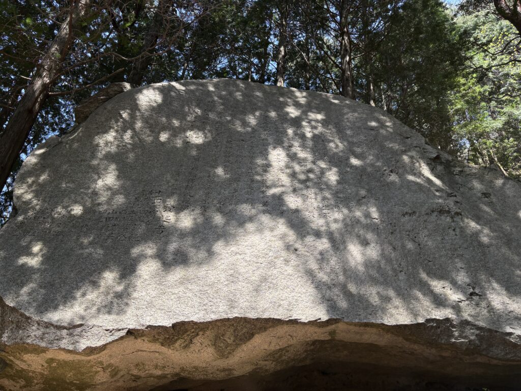 本殿から急な階段を降りて行くと、左側の少し奥まったところにお経の書いてある心経岩があります。