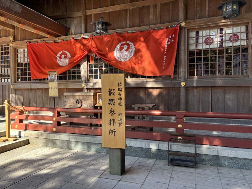 以前は独立した社殿があったのですが、現在建て替え中のため、猿田彦神社の右端に臨時の参拝所が設けられています。